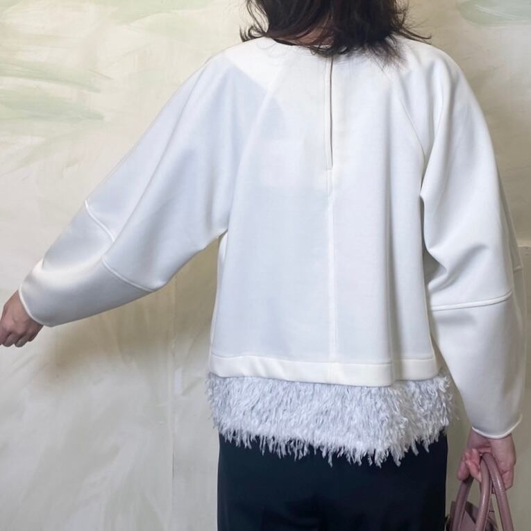 ヘムはフェザーライクなフリンジで切り替え華やかな印象に。