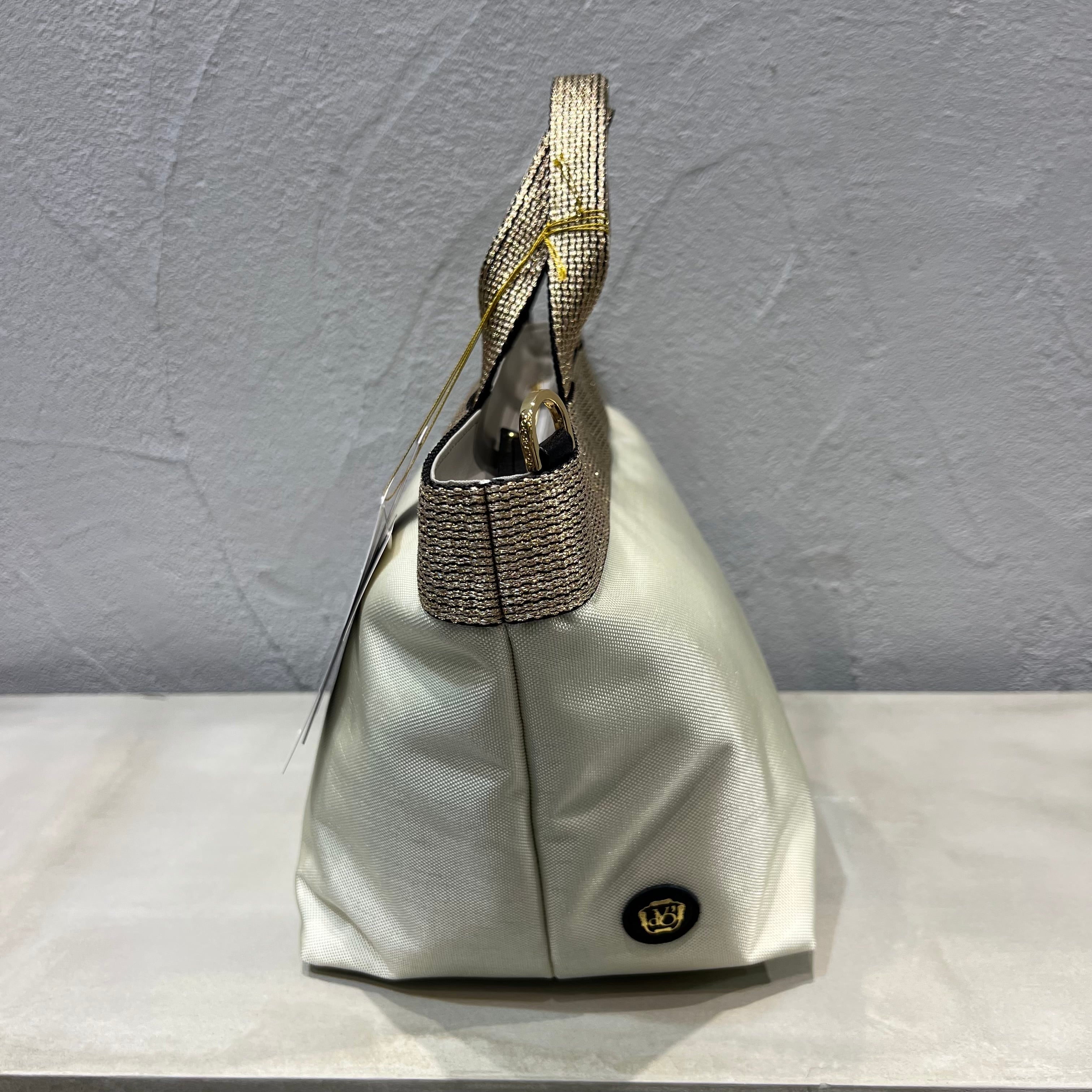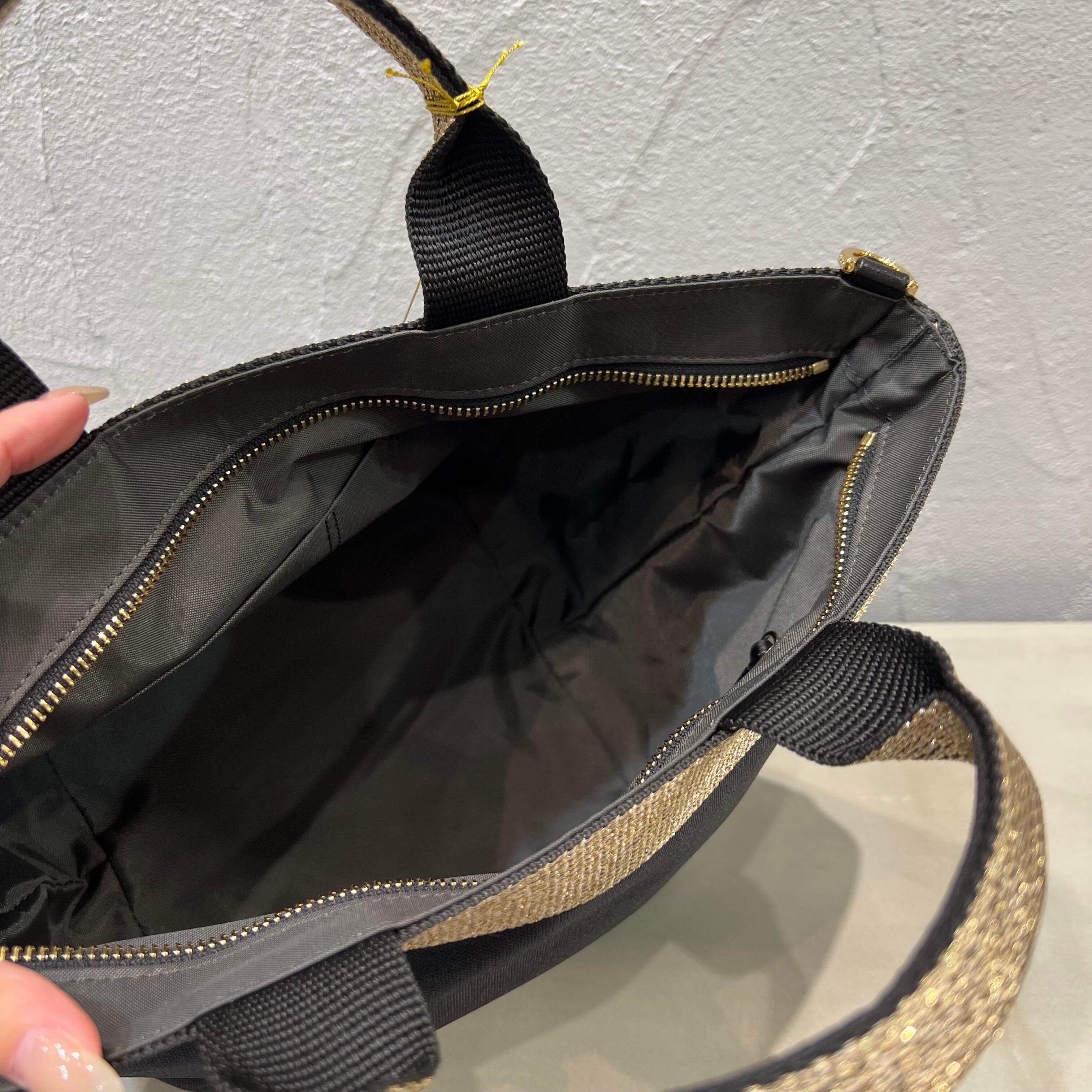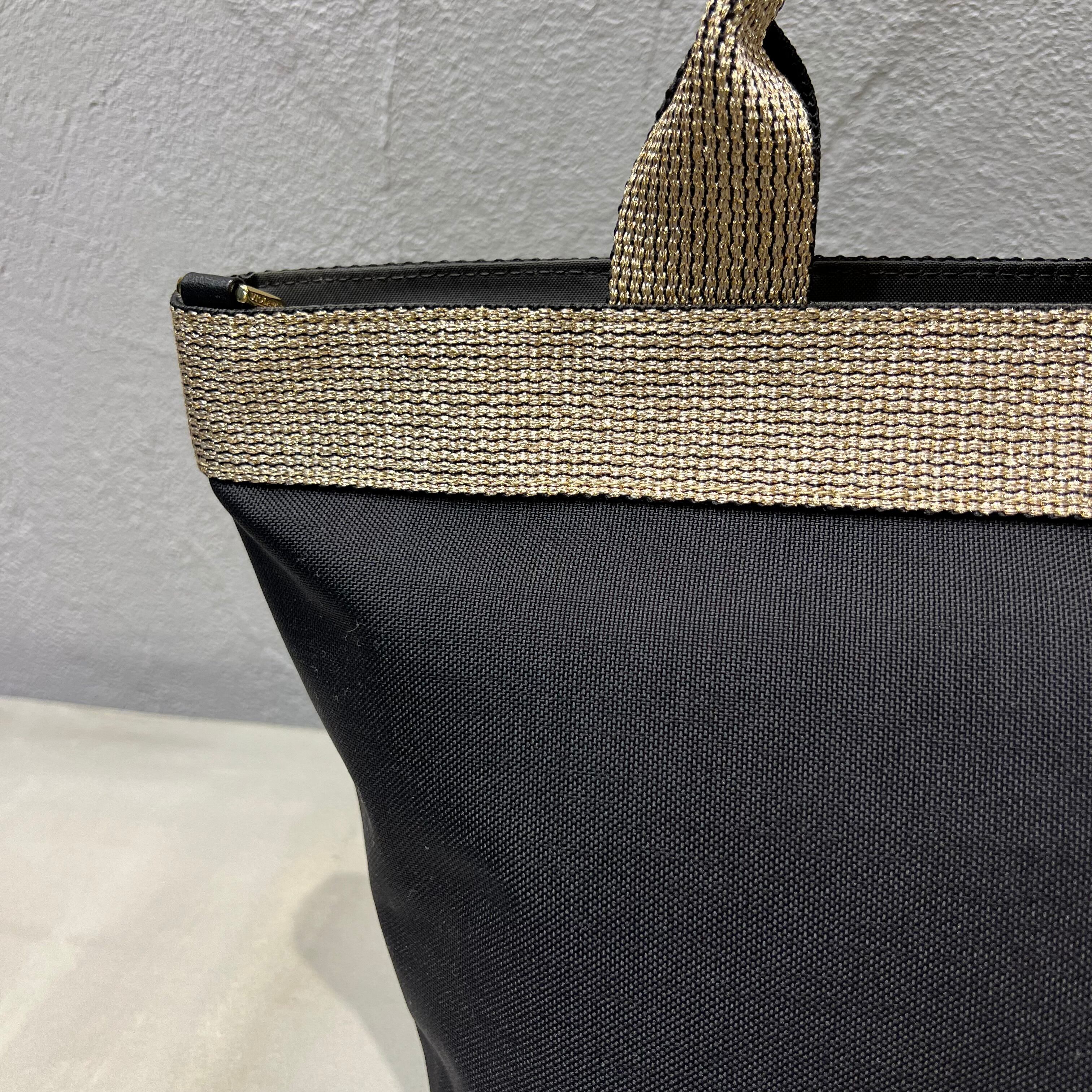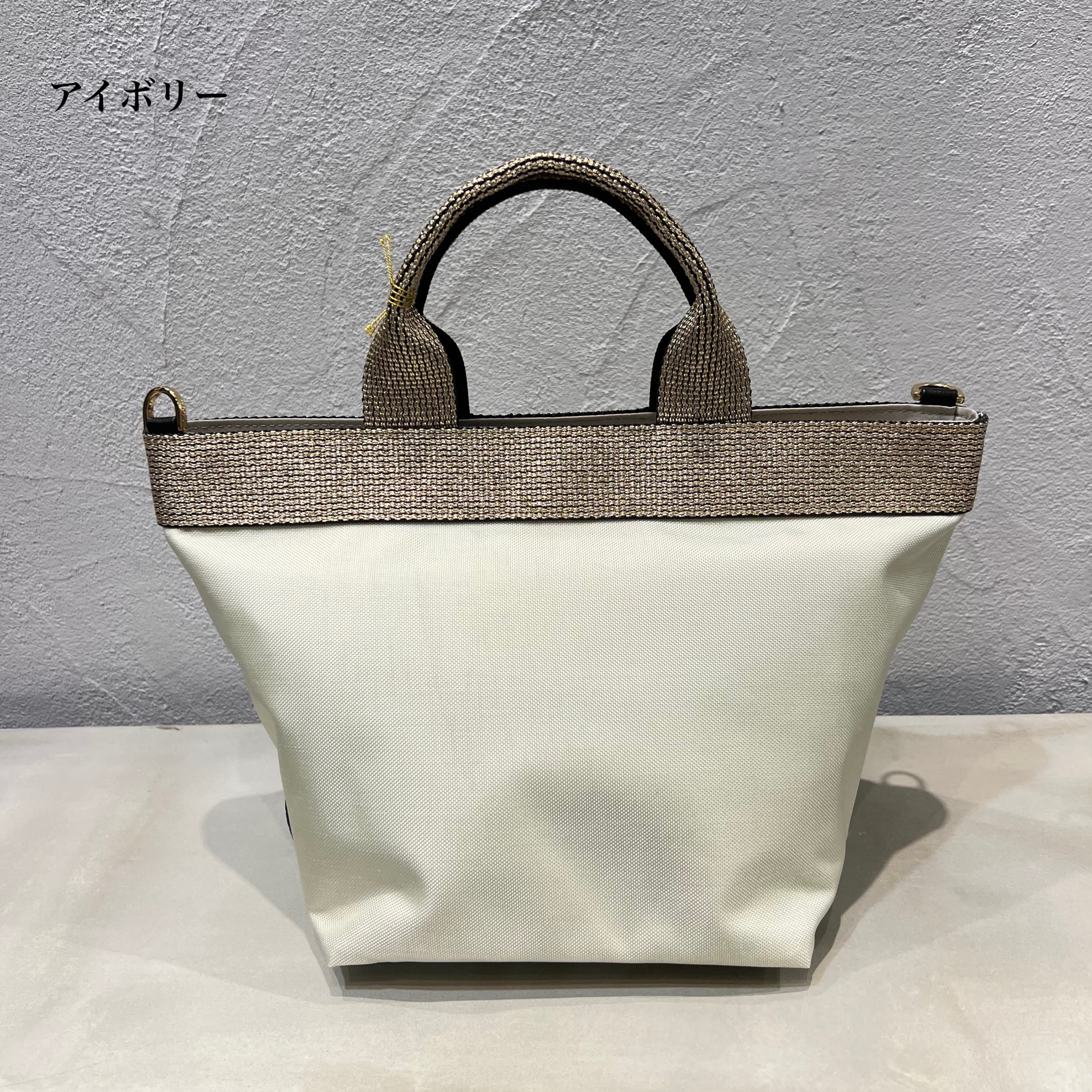 ムラ感と凹凸のあるナイロン生地は丈夫で上品なカジュアル感があり、ゴールドのテープハンドルが女性らしい雰囲気です。