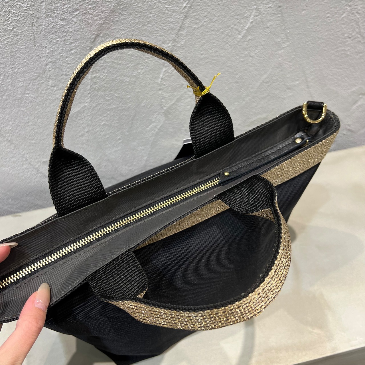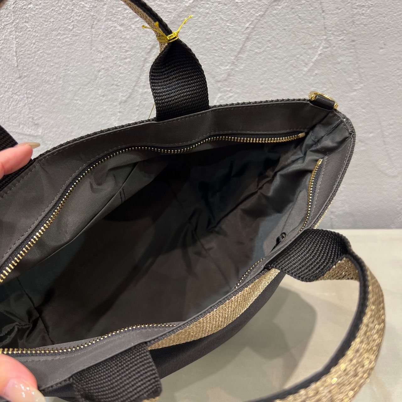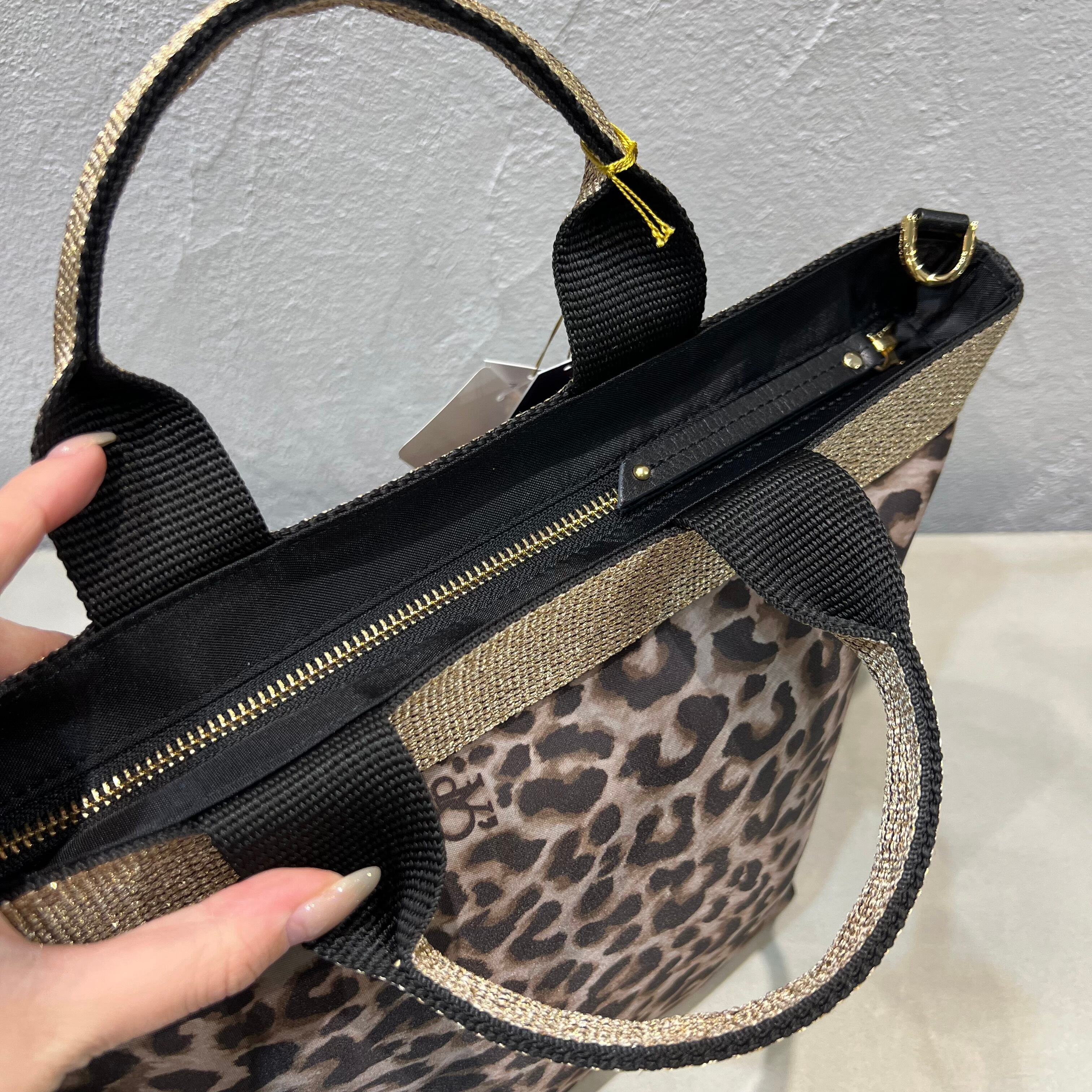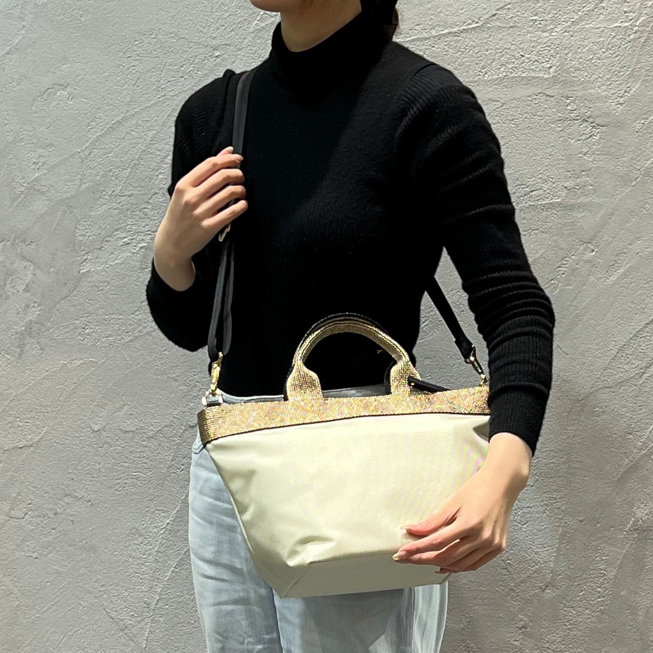 ムラ感と凹凸のあるナイロン生地は丈夫で上品なカジュアル感があり、ゴールドのテープハンドルが女性らしい雰囲気です。