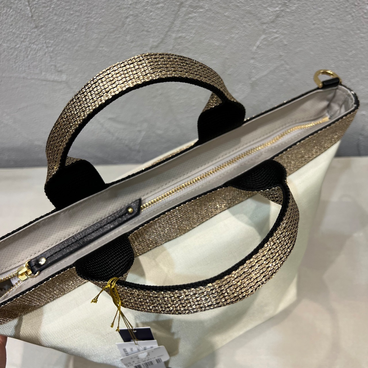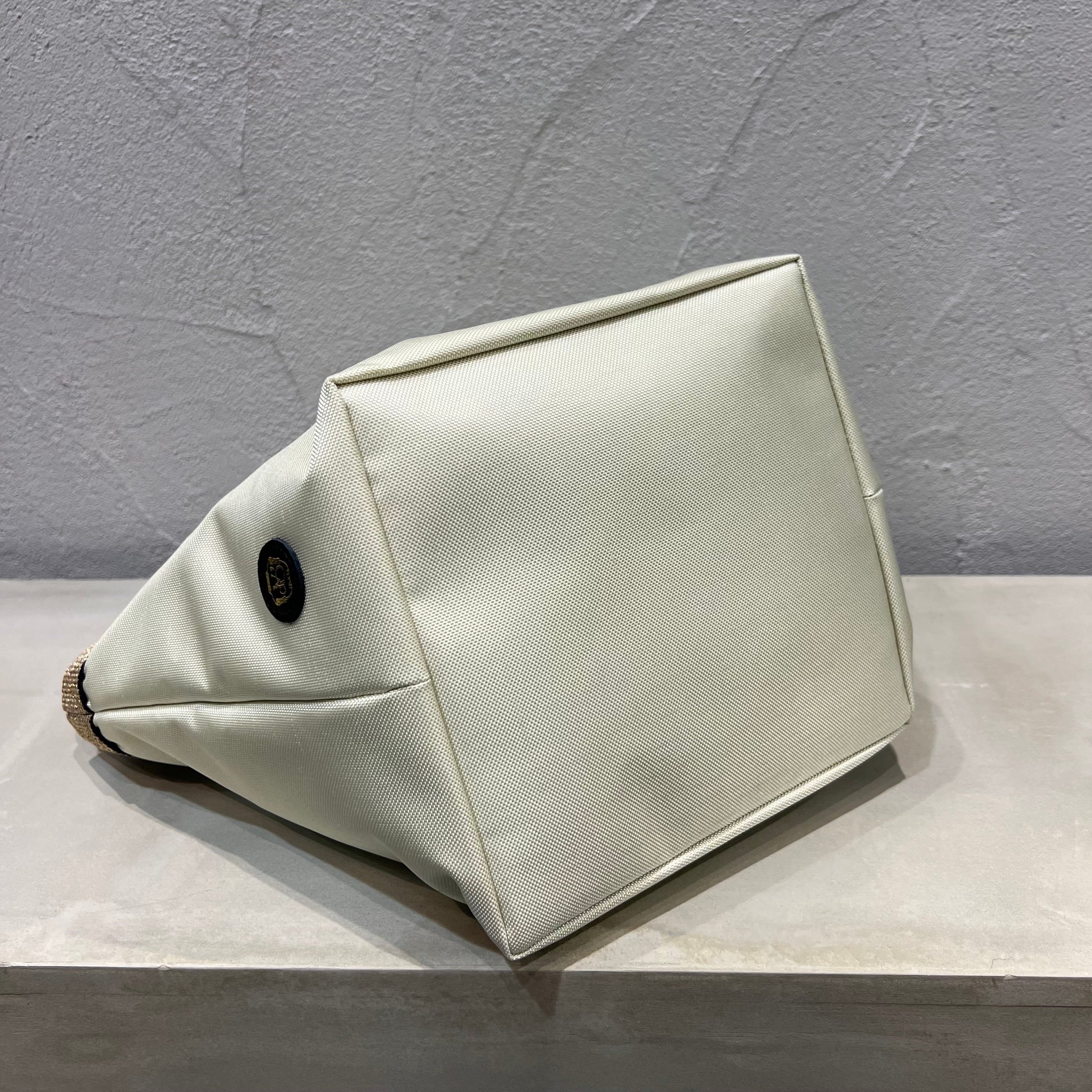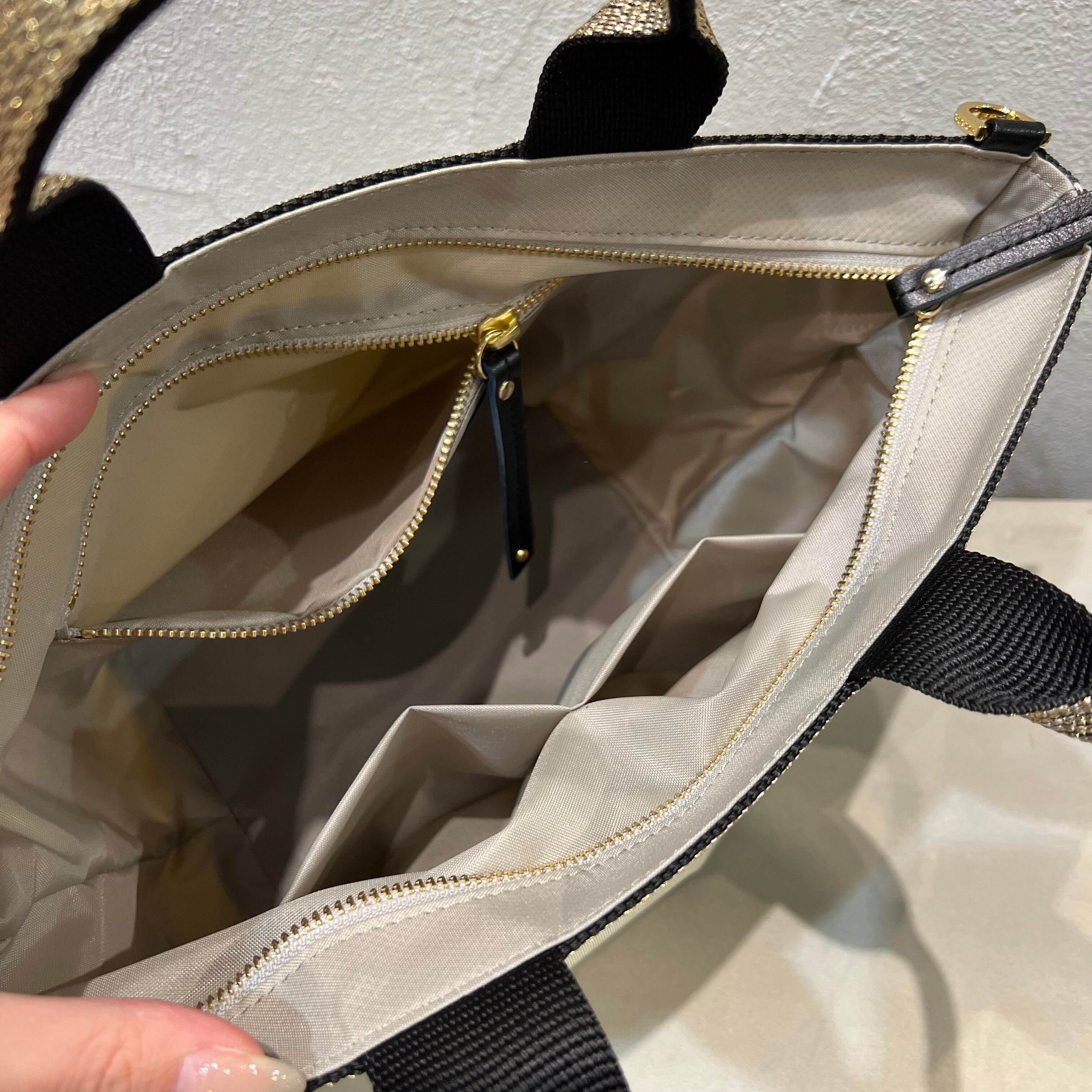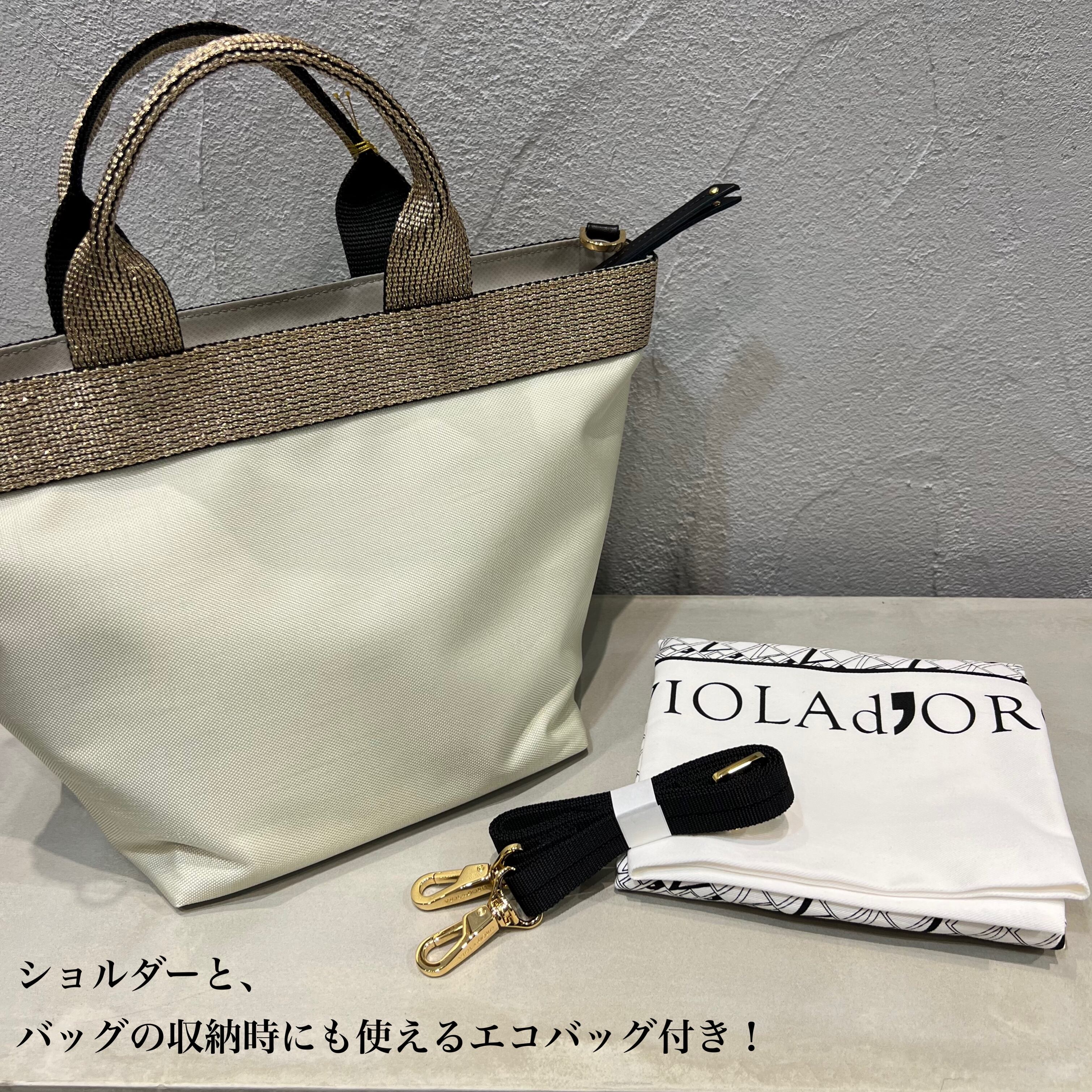 ムラ感と凹凸のあるナイロン生地は丈夫で上品なカジュアル感があり、ゴールドのテープハンドルが女性らしい雰囲気です。