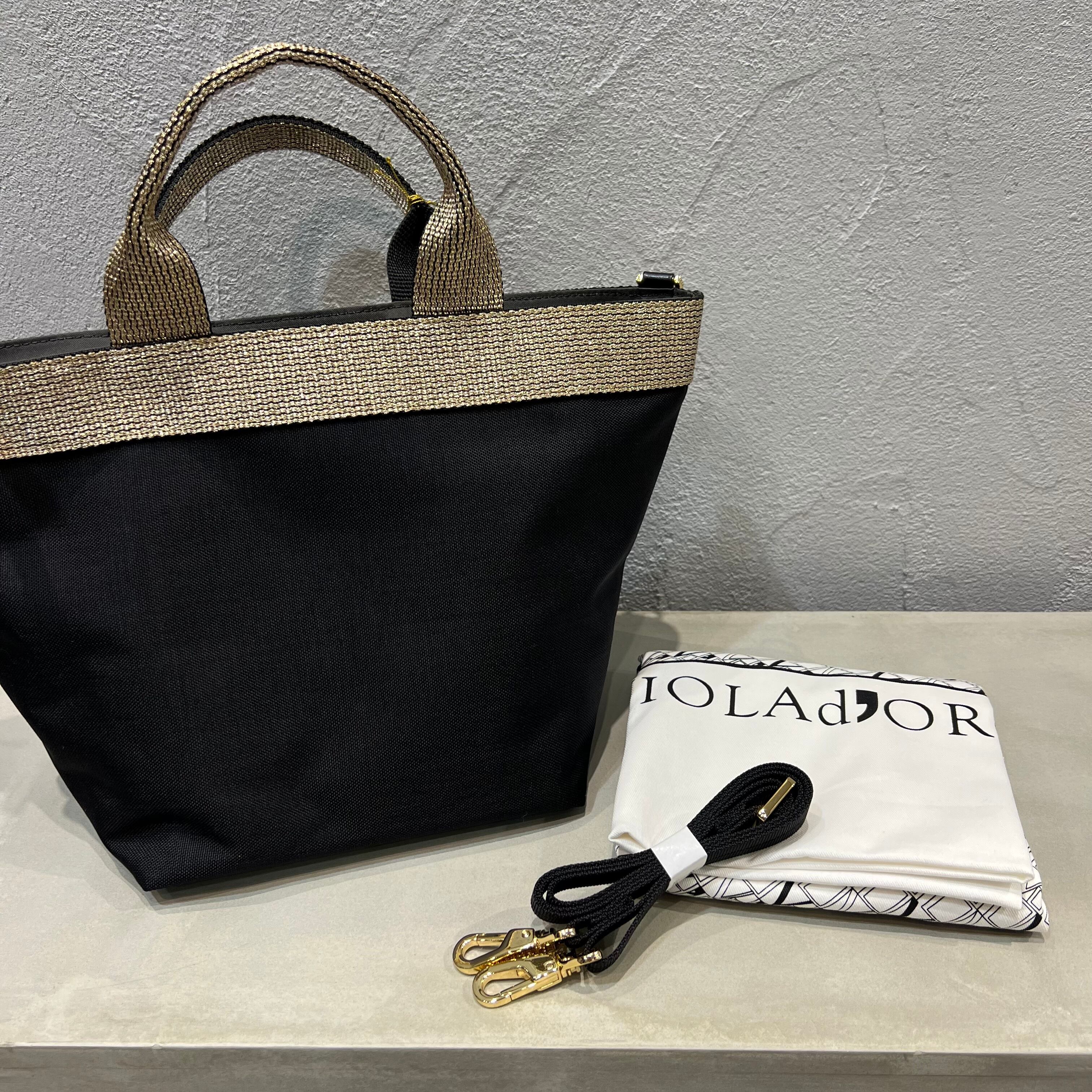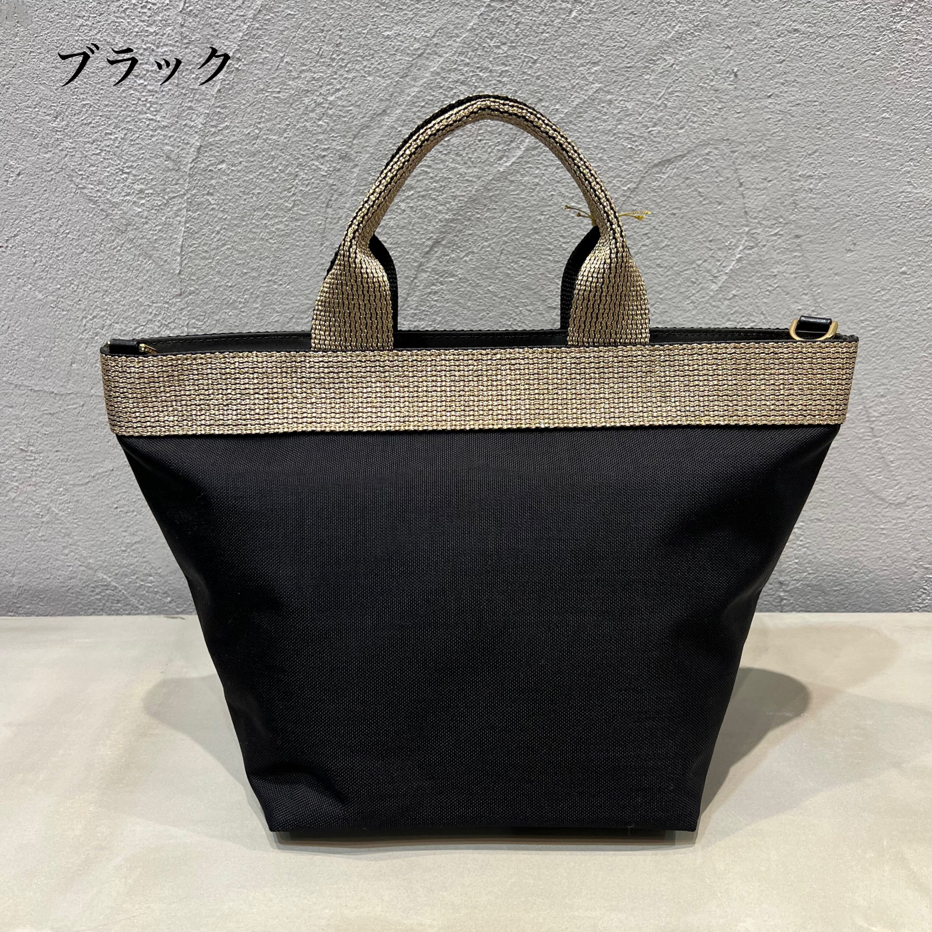ベーシックなフォルムにゴールドのテープが印象的なナイロントートバッグのMサイズ。