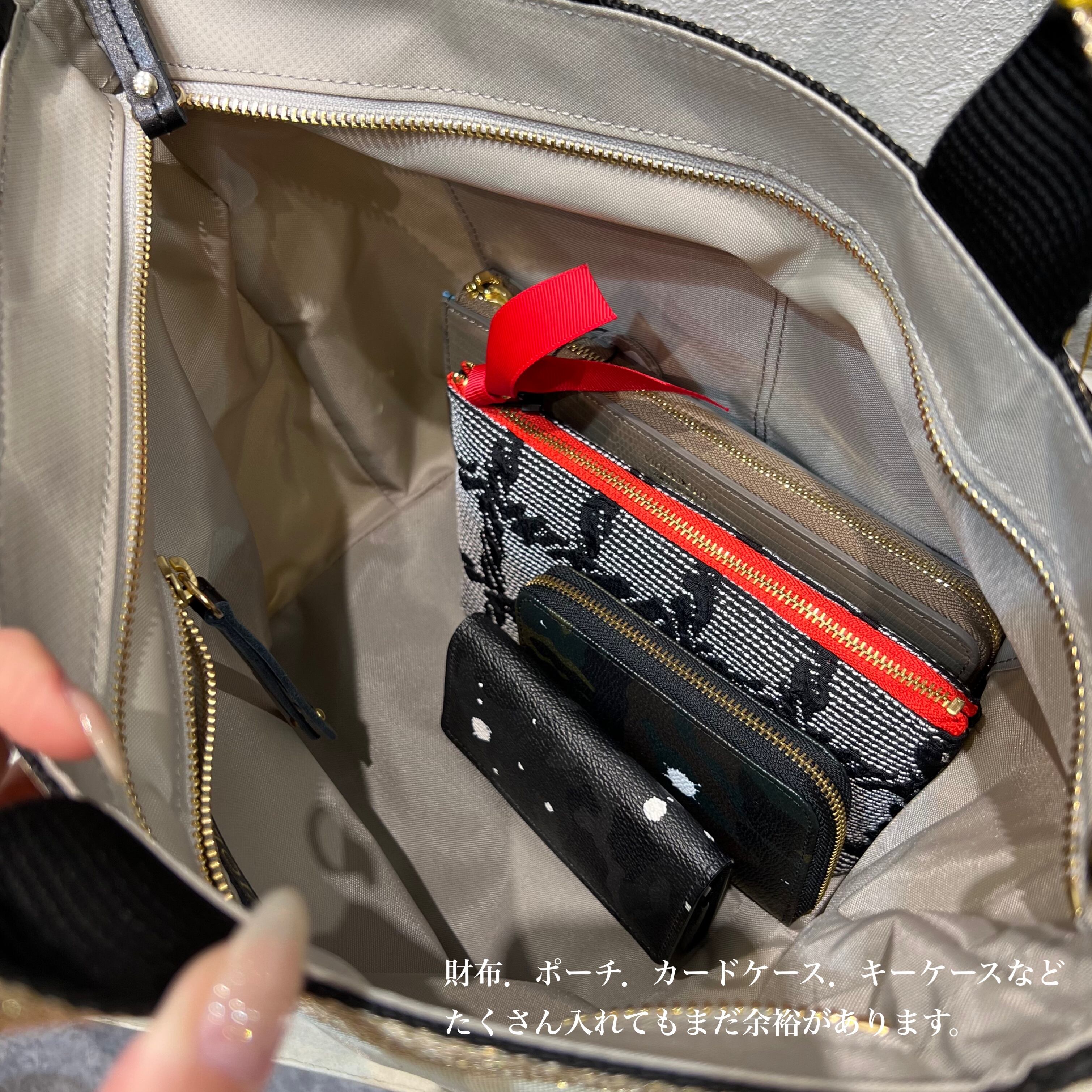 見た目はコンパクトですが長財布など身の回りのものがしっかり収まり、ショルダーストラップを使用してポシェットとしても使える2WAY使用も魅力です。